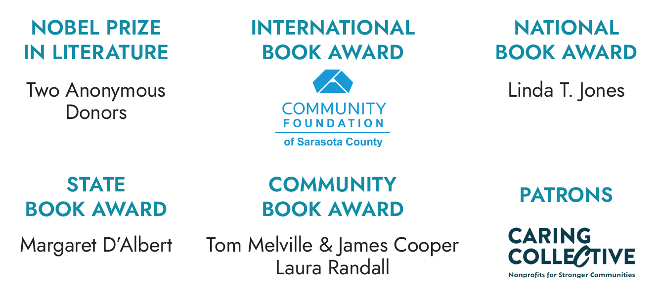 Graphic listing luncheon sponsors and award levels: Nobel Prize in Literature—Two Anonymous Donors; International Book Award—Community Foundation of Sarasota County; National Book Award—Linda T. Jones; State Book Award—Margaret D’Albert; Community Book Award—Tom Melville, James Cooper, and Laura Randall; Patrons—Caring Collective.